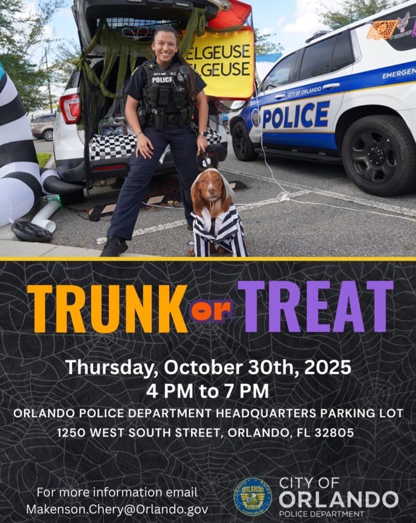 O local será a sede do OPD, no endereço 1250 West South Street, Orlando, FL 32805. E a ideia é simples — mas perfeita para crianças e adultos: decorações de “trunks” (tampas traseiras de carros), fantasias, doces e muita diversão com segurança.